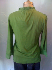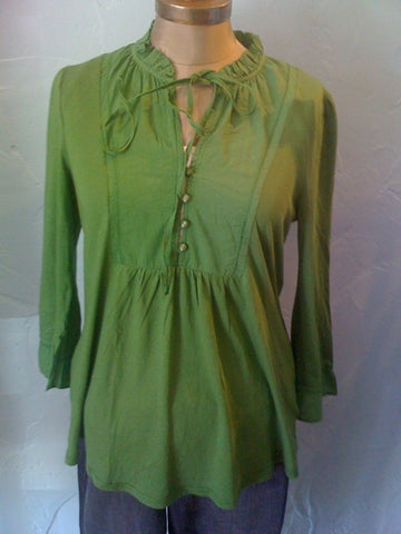Woven panels in a tonal shade flank the button-and-loop half placket on the front of a soft knit top. A dainty, ruffled collar adds feminine flair.