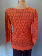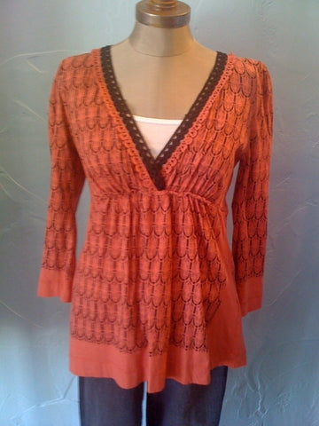 A great coral and black print featured in an v neck with a drawstring tie at the empire waist and 3/4 length bell sleeves.